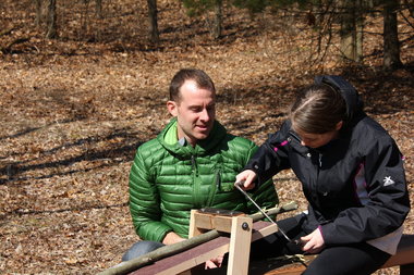 Leader David Buth, of Grand Rapids, coaches Arynn Hans, of Grand Rapids, as she uses a shave horse and draw knife to peel bark from a maple sapling she is working into a walking stick