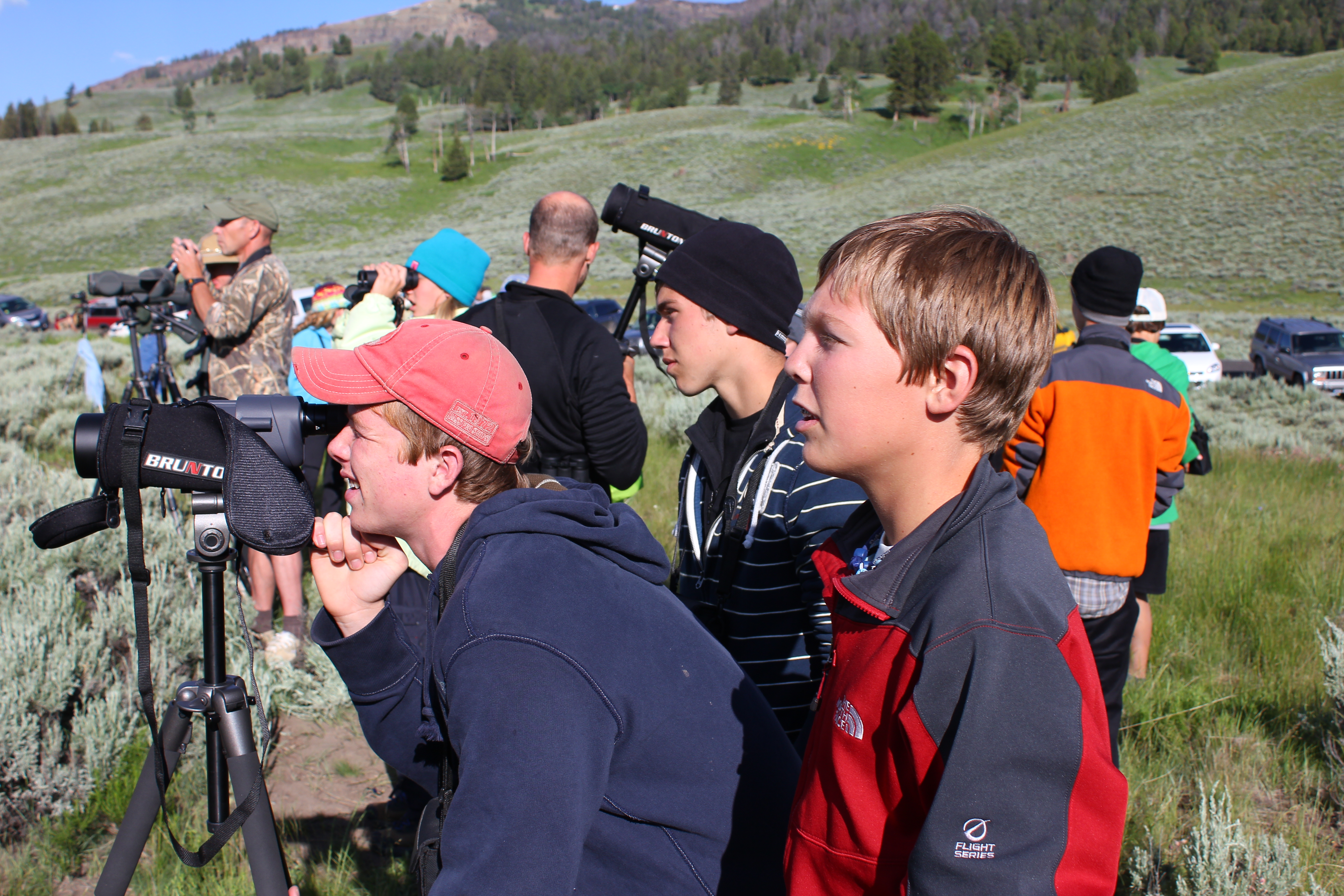 Zac Corell and Tristan Ogdahl, of Grand Rapids, and Jacob Tubergen, of Rockford, use spotting scopes to view wolves and grizzly bears sharing a bison carcass along Soda Butte Creek in Yellowstone National Park