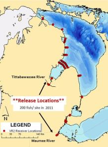 The preliminary 2011 information is the first take from the three-year study funded by the Great Lakes Restoration Initiative. To date, $5 million has been spent to set up a network of hydro-acoustic sensors. The 350 sensors installed so far are used for a variety of research projects like tracking walleye, sea lampreys, lake trout, Great Lakes sturgeon, and Asian carp, according to Marc Gaden, communications coordinator with the Great Lakes Fishery Commission.