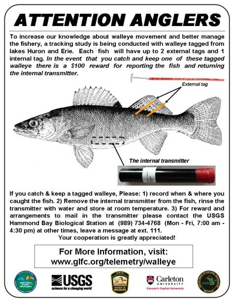 Anglers are being encouraged to help with the walleye project by returning any fish found with a transmitter and tag, which has numbers to contact. The reward is $100 for each.