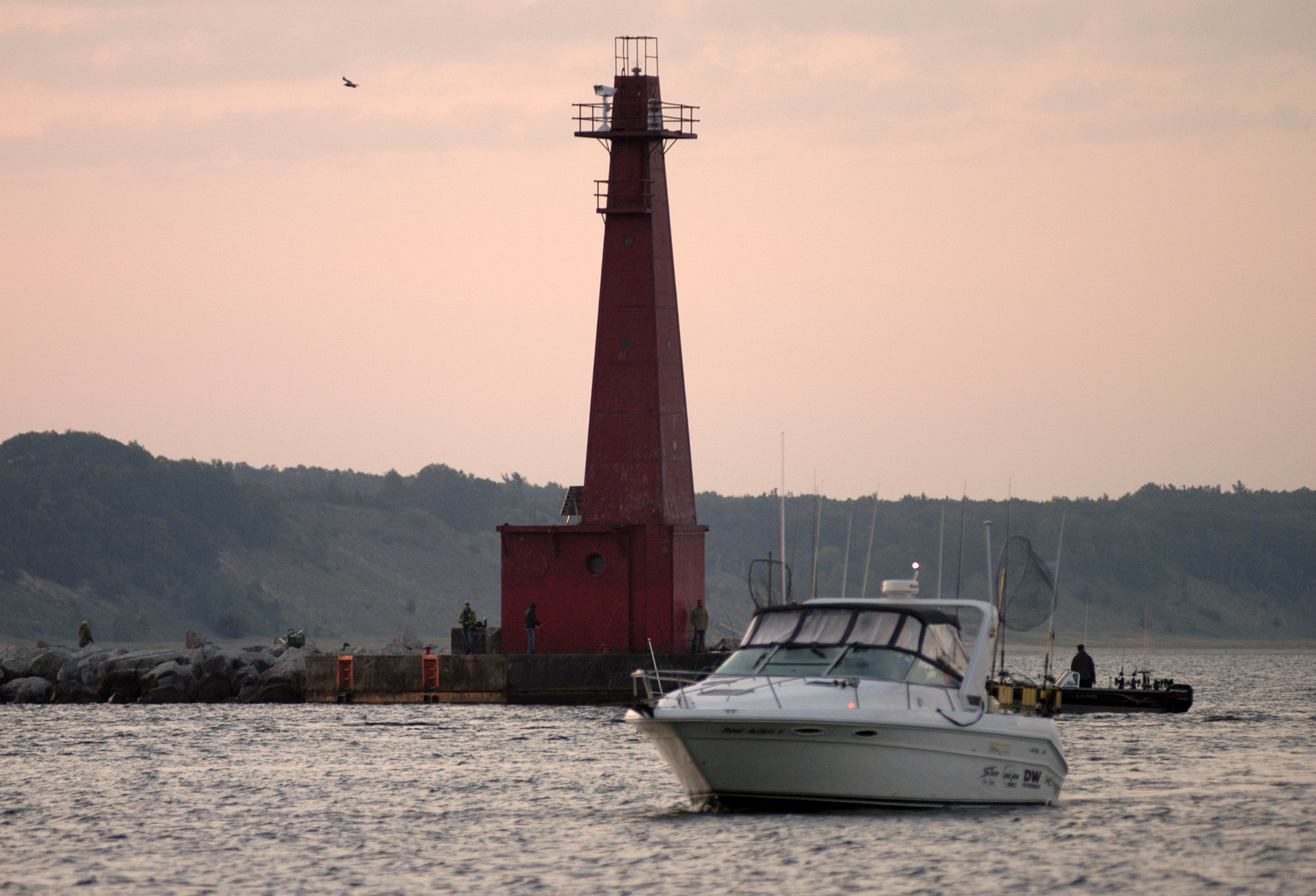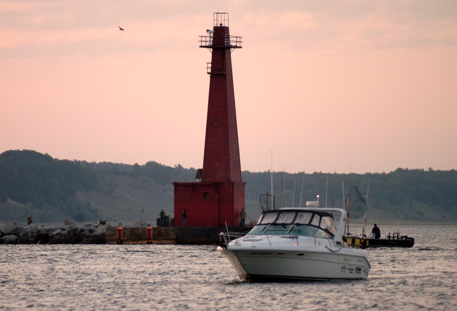 Anglers fish for salmon just after dawn off Muskegon. Ports from Muskegon south will be watched closely once the state reduces salmon stocking in 2013. Photo: Howard Meyerson