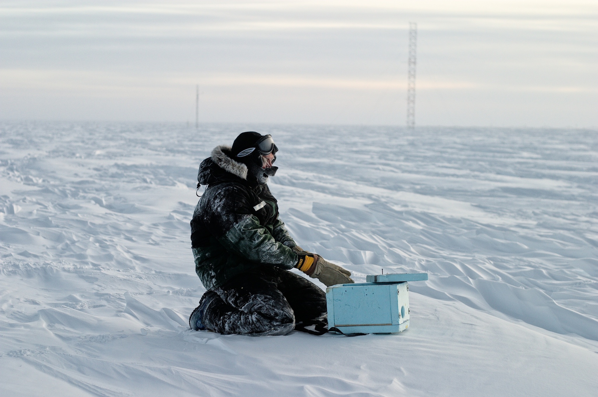Keith Reimink films on the polar plateau. The camera box is made from insulated blue foam that holds in heat. The heat source is a lead weight that was heated in a convection oven. It allowed for hours of filming. Courtesy photo.