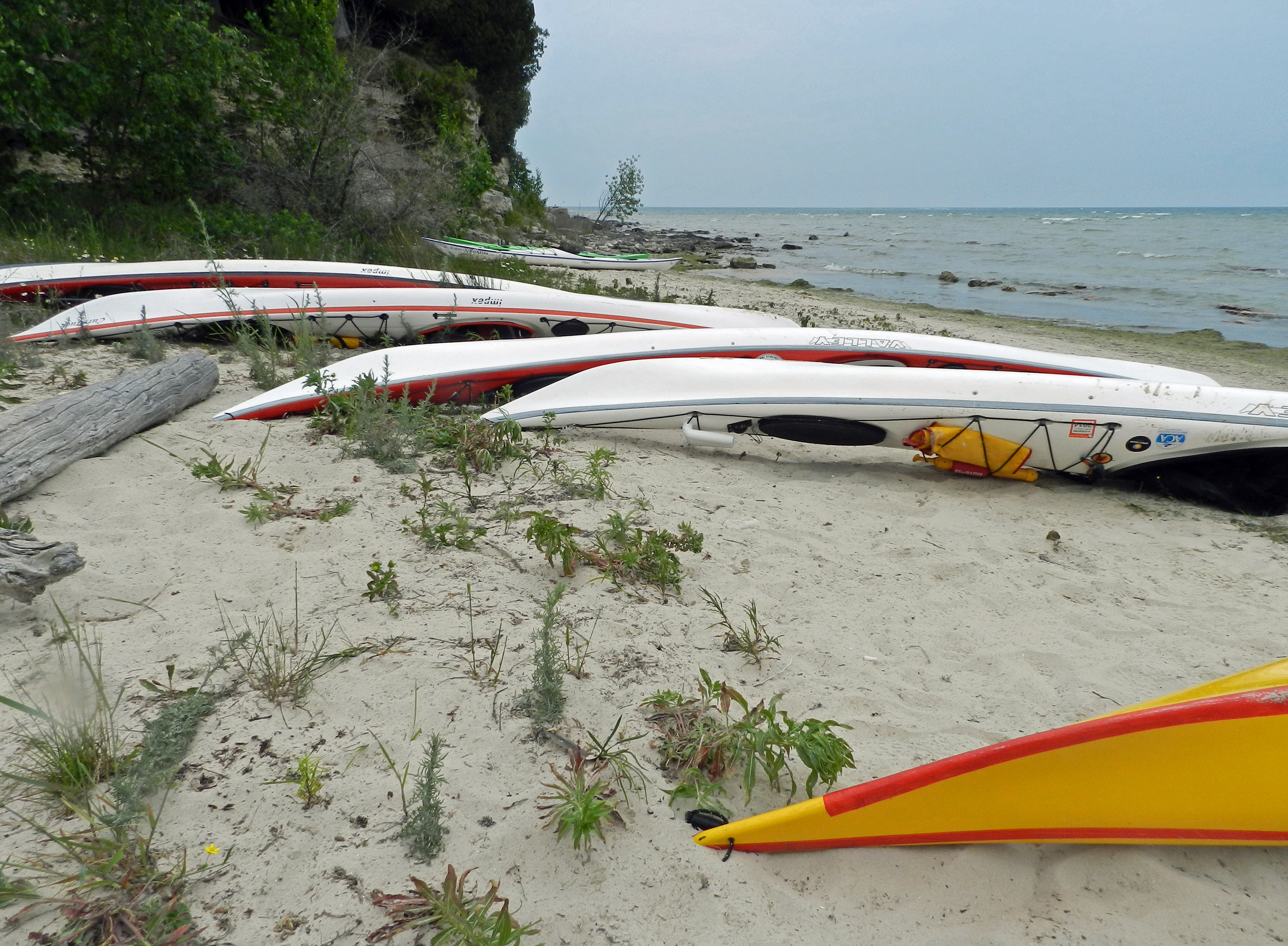 Paddlers take a break on the rocky shore of Rock Island State Park in Door County Wisconsin. Photo: Ken Braband.
