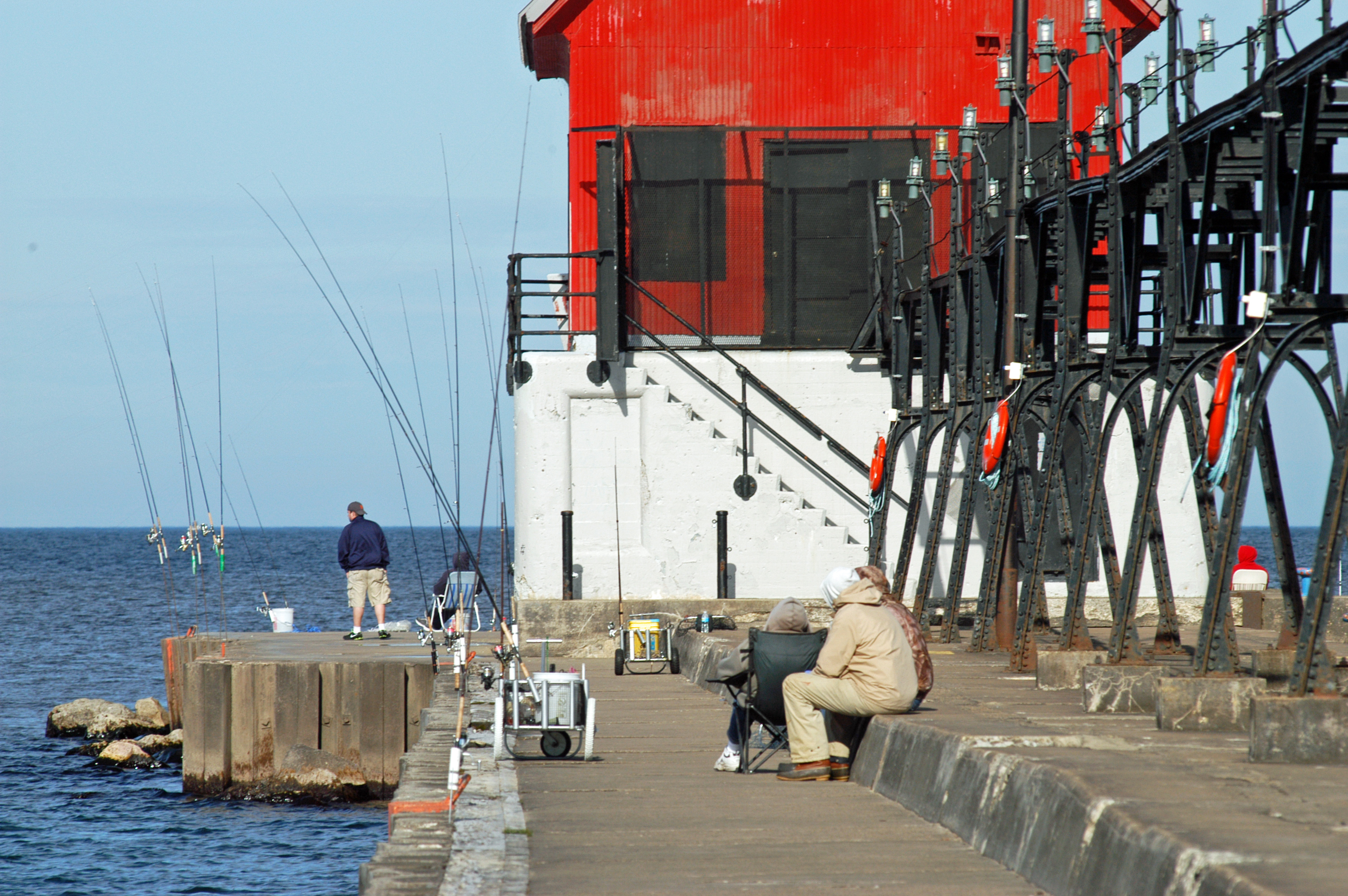 Anglers on the Grand Haven pier wait for a bite. Some say fishing has been slow, but some larger salmon were caught earlier this spring. Photo: Howard Meyerson
