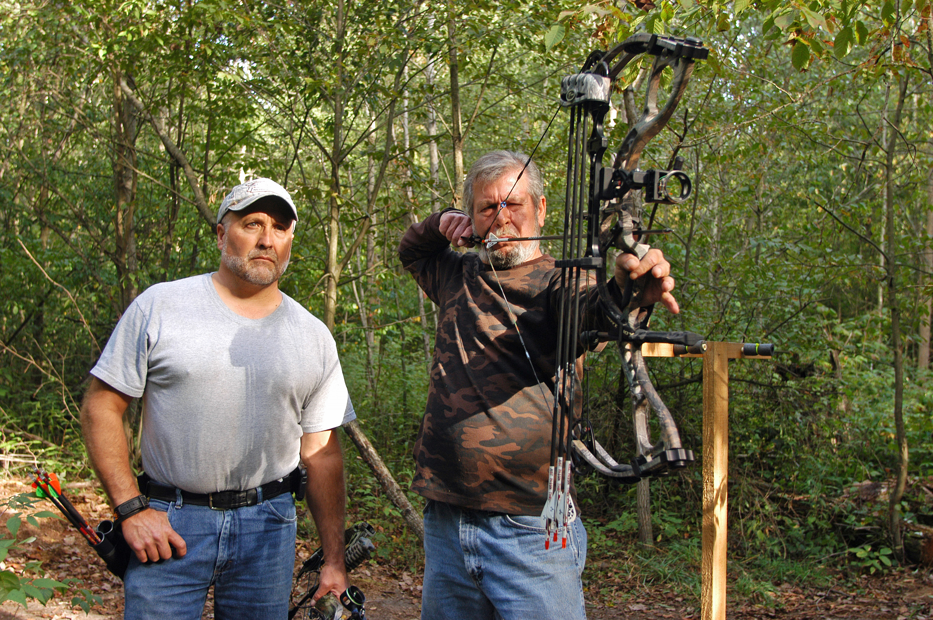Mike Niva (left) looks over Mike Kotecki’s shoulder as he practices for the opening of archery deer season and draws a bead on a 3-D target at the Fruitport Conservation Club. Photo: Howard Meyerson