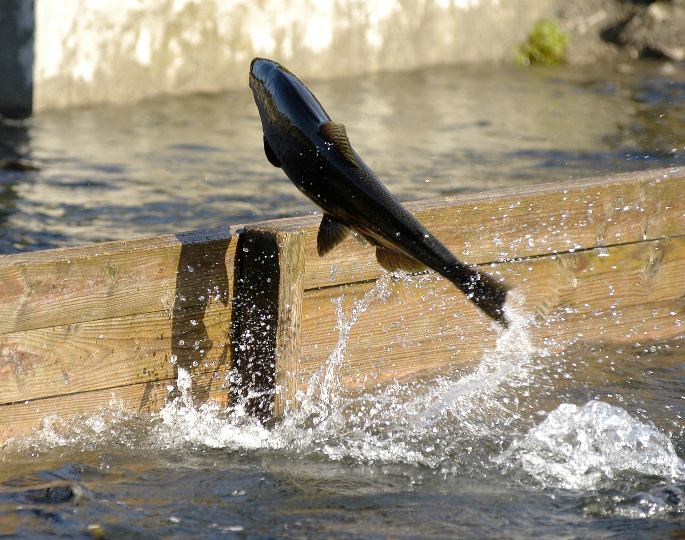 A chinook salmon leaps from one raceway to another at the Little Manistee River weir where eggs are collected. Photo: Howard Meyerson