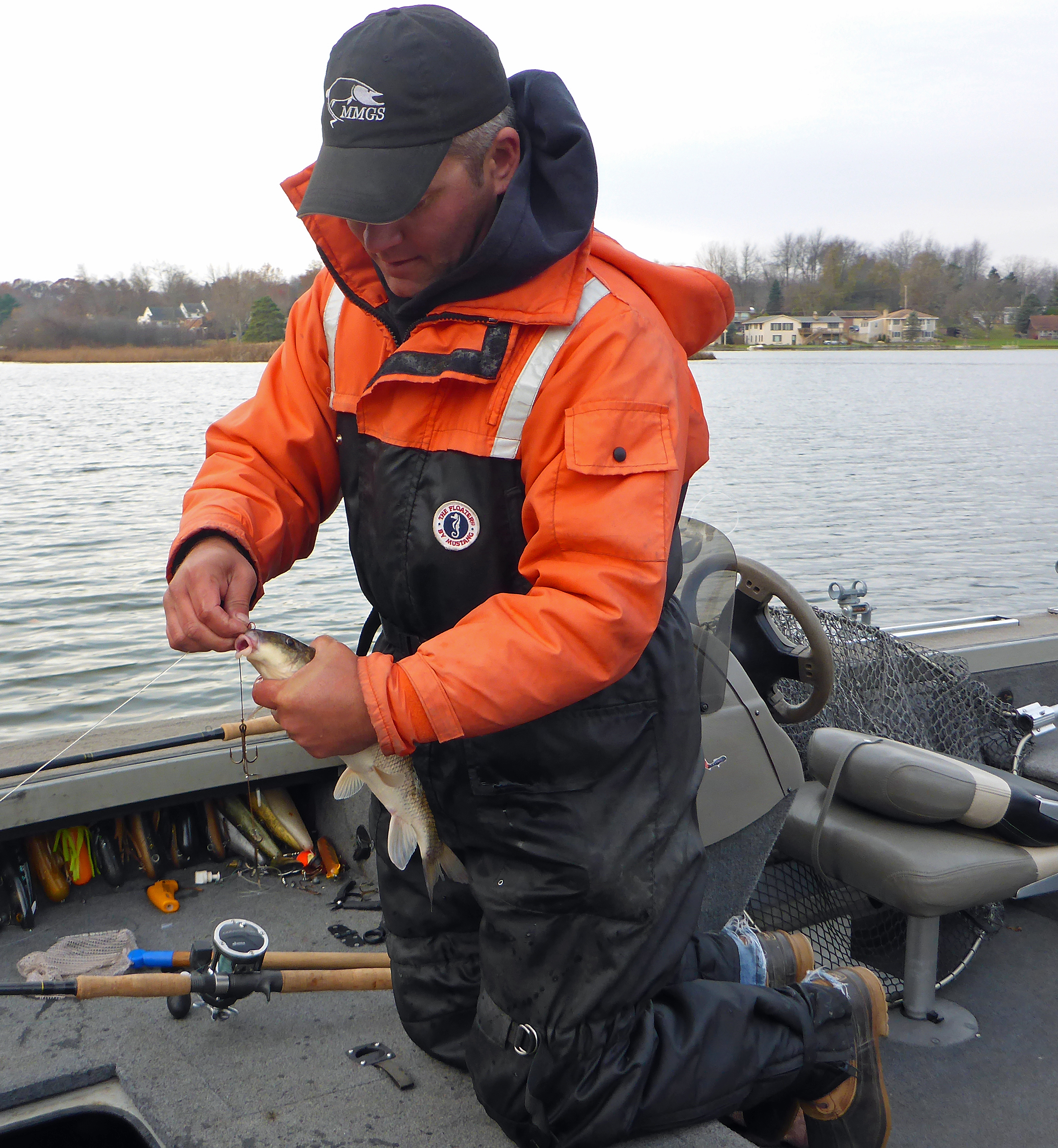 Will Schultz rigs up a live sucker which proved to be what muskies wanted on this cold Novemeber day. Photo: Howard Meyerson