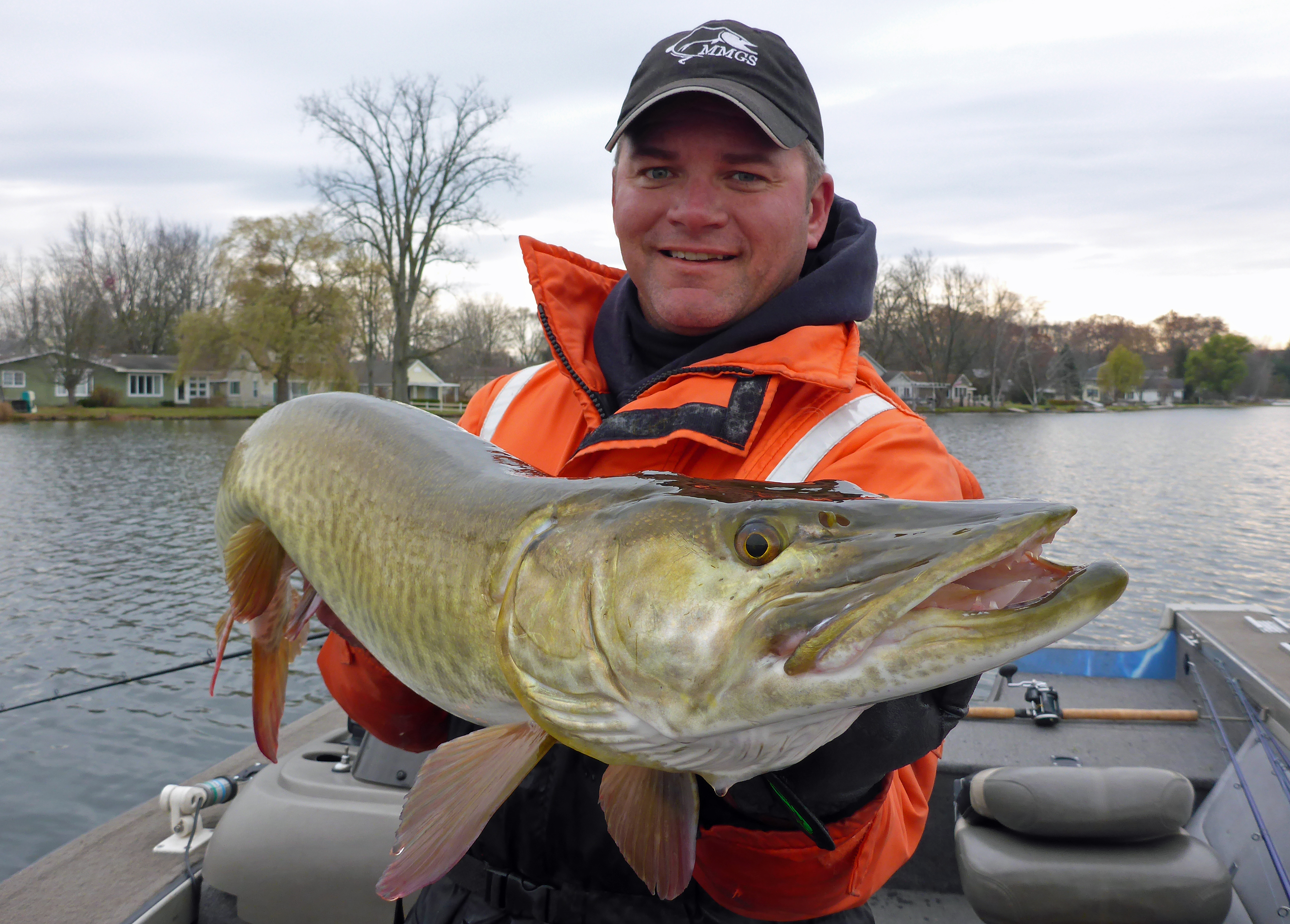 Will Schultz shows off a nice 47-inch muskie that was caught while fishing live suckers on Campau Lake in Kent County, MI. Photo: Howard Meyerson