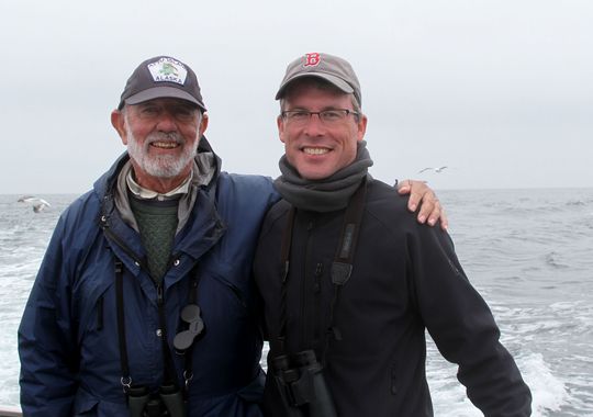 Neil Hayward, right, meets Sandy Komito, the reigning North American champion in bird listing, on a pelagic trip off the California coast July 28, 2013. It was like a scene from the 2011 movie “The Big Year,” in which Owen Wilson, playing Komito, runs into two rivals on a boat while surreptitiously attempting to break his own birding record. On this trip in July, Hayward also bumped into his only other 2013 Big Year rival, Jay Lehman.(Photo: Courtesy of Neil Hayward)