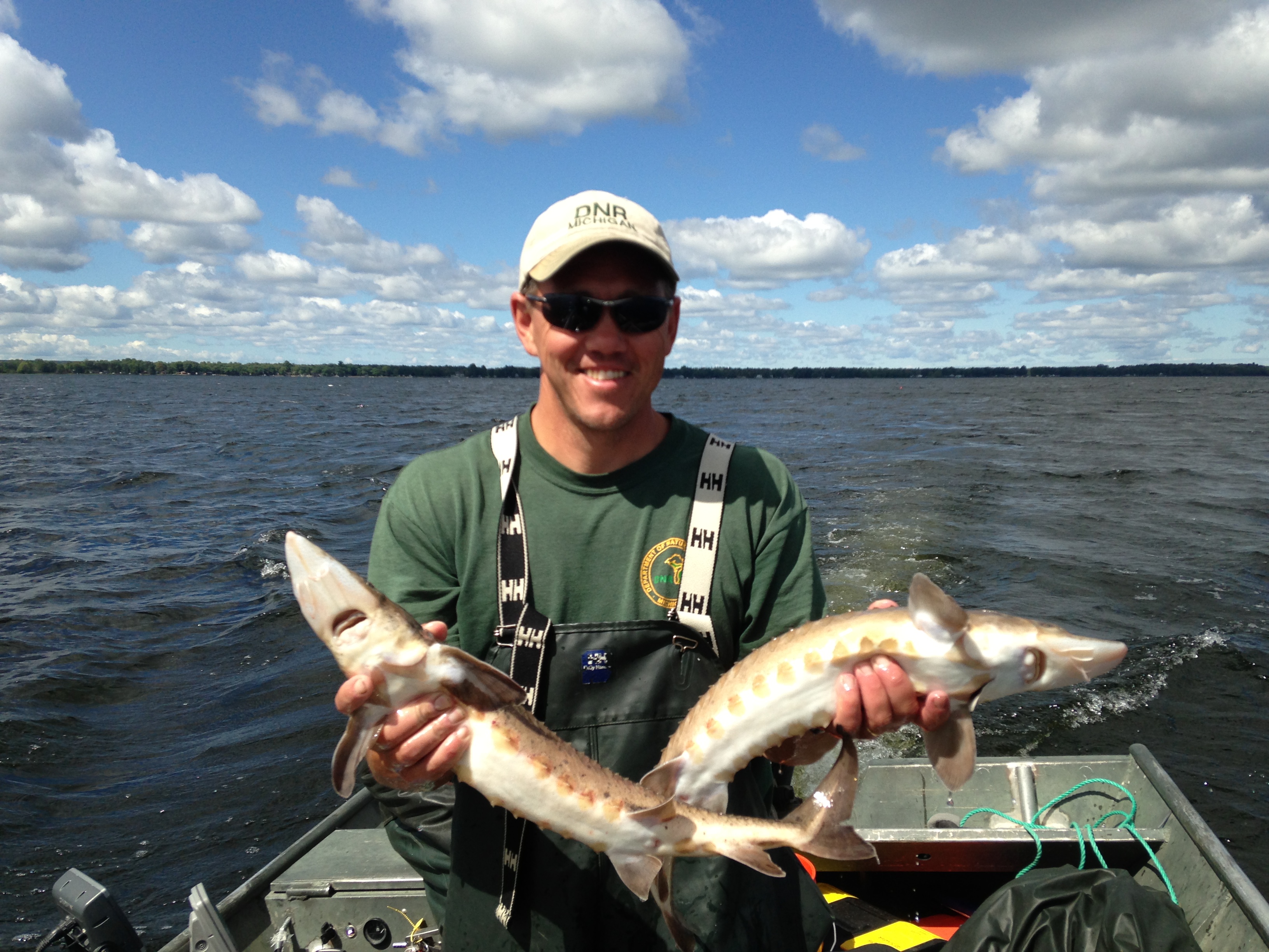 Michigan DNR fisheries staffer, Chris Schelb holds up two small sturgeon netted in Black Lake in August 2013. Photo courtesy MDNR.