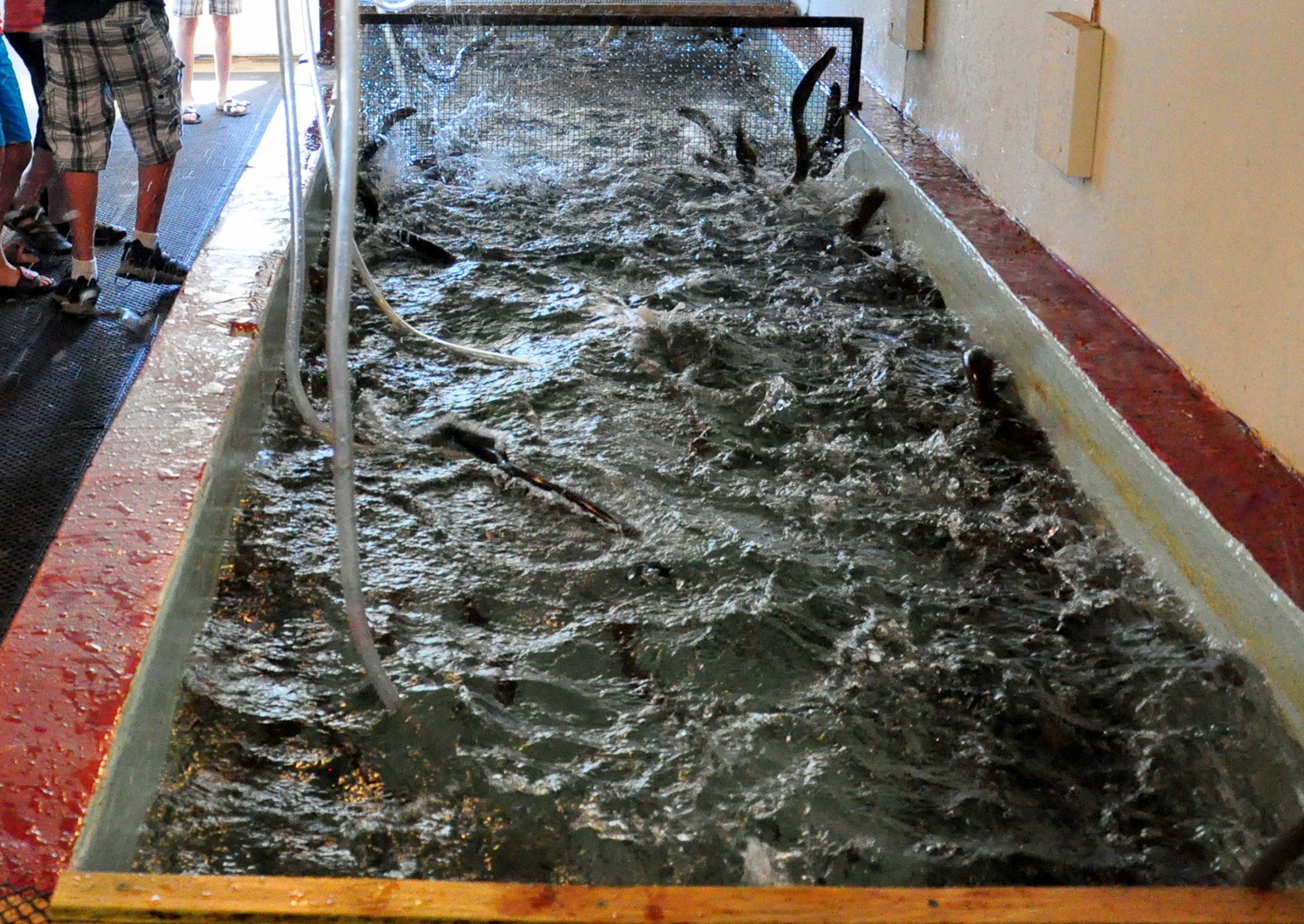 Captive sea lamprey (in a laboratory raceway) respond to the alarm substance added to the water. The alarm substance greatly increases the activity level of the sea lamprey, even causing some sea lamprey to jump out of the water. Photo: Andrea Miehls, Great Lakes Fishery Commission.