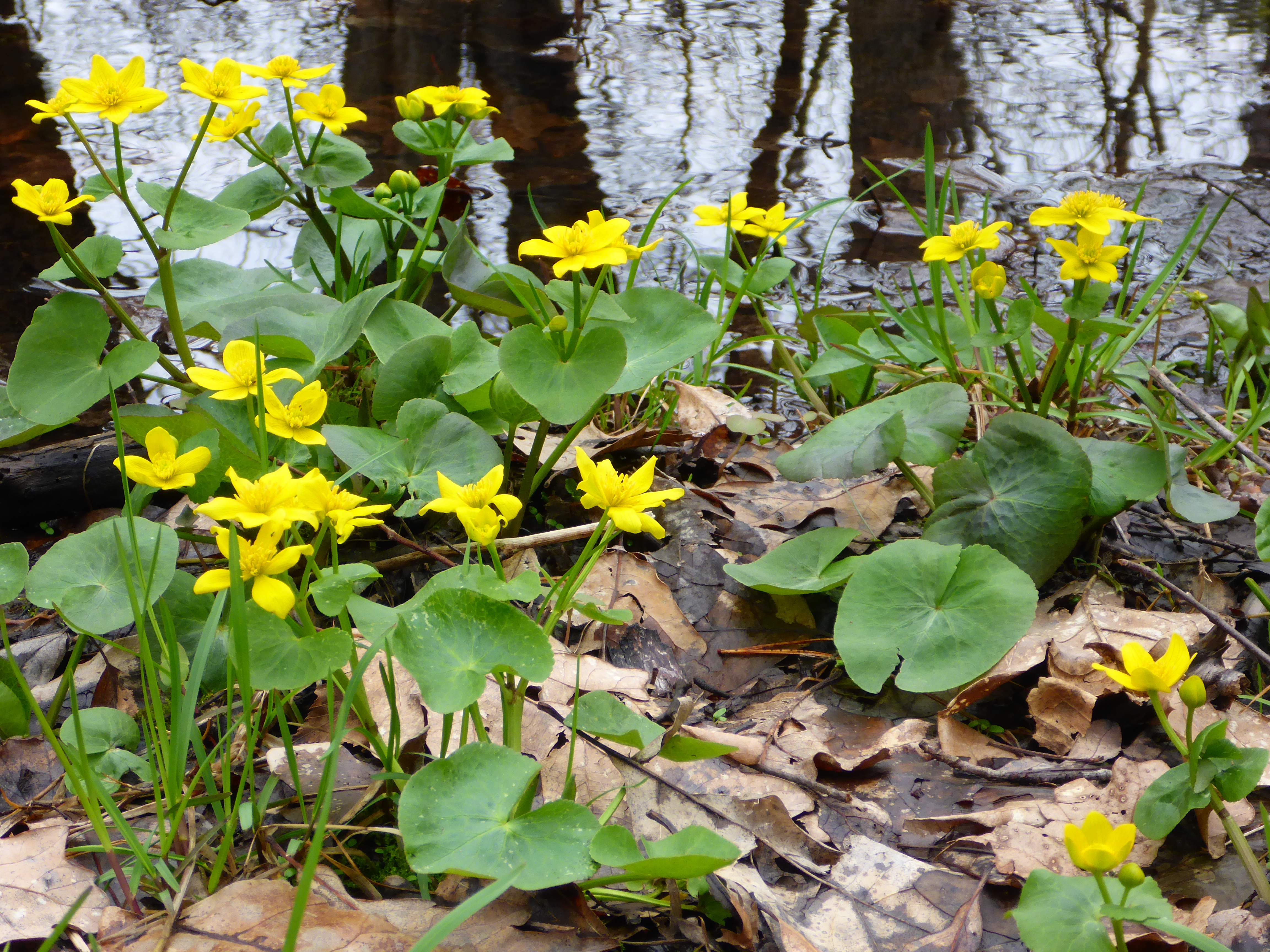Tiny, round-lobed hepaticas were blooming on the trail along with star flowers and blood root, sometimes known as red puccoon. Bright yellow marsh marigolds grew along stream banks. Cinnamon ferns were just breaking through the leaf cover and wintergreen could be found all along the trail.
