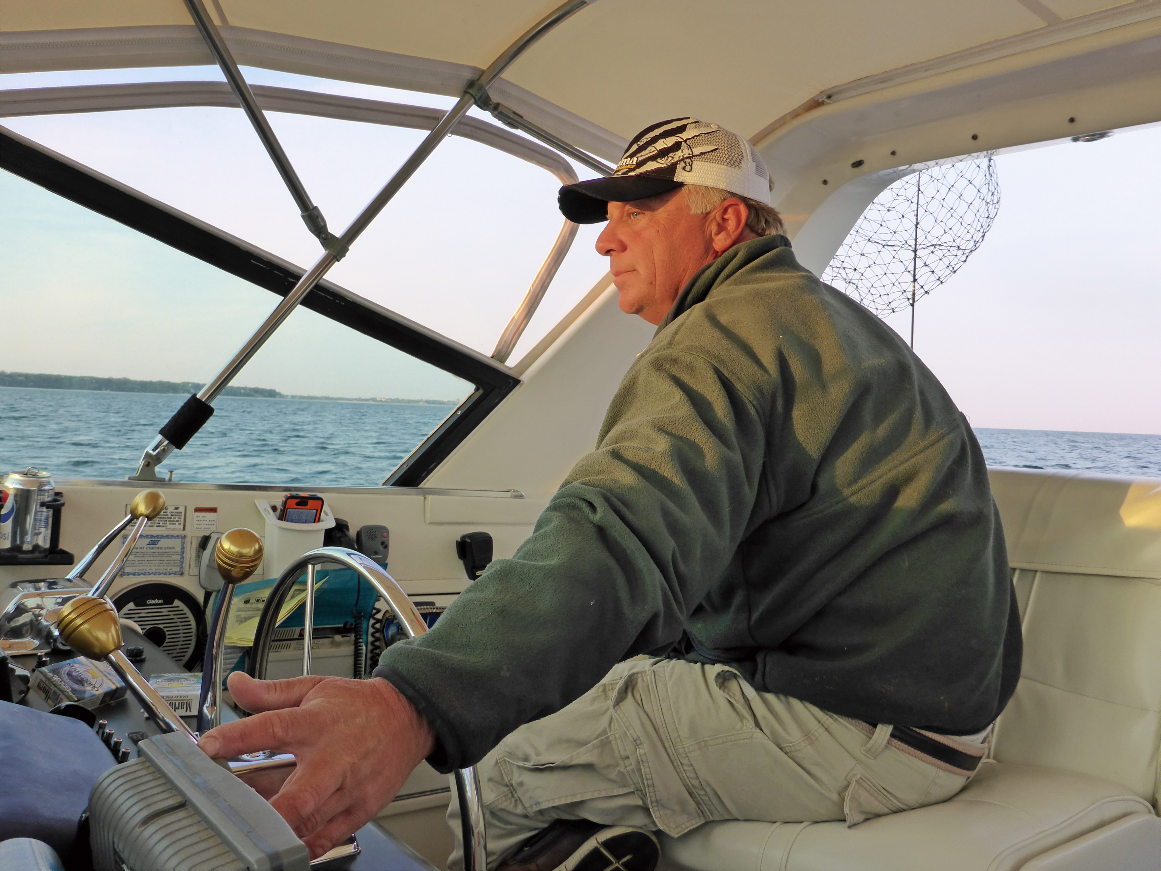 “The water today is just 48.4 degrees F,” Clark had said earlier, at sunrise while motoring out beyond the St. Joseph pier. He is a 30-year veteran captain who runs his 36-foot Tiara out of Benton Harbor. “That’s 10 degrees colder than last year. Cold water seems to keep the fish in closer and longer down here in the southern part of the lake.”