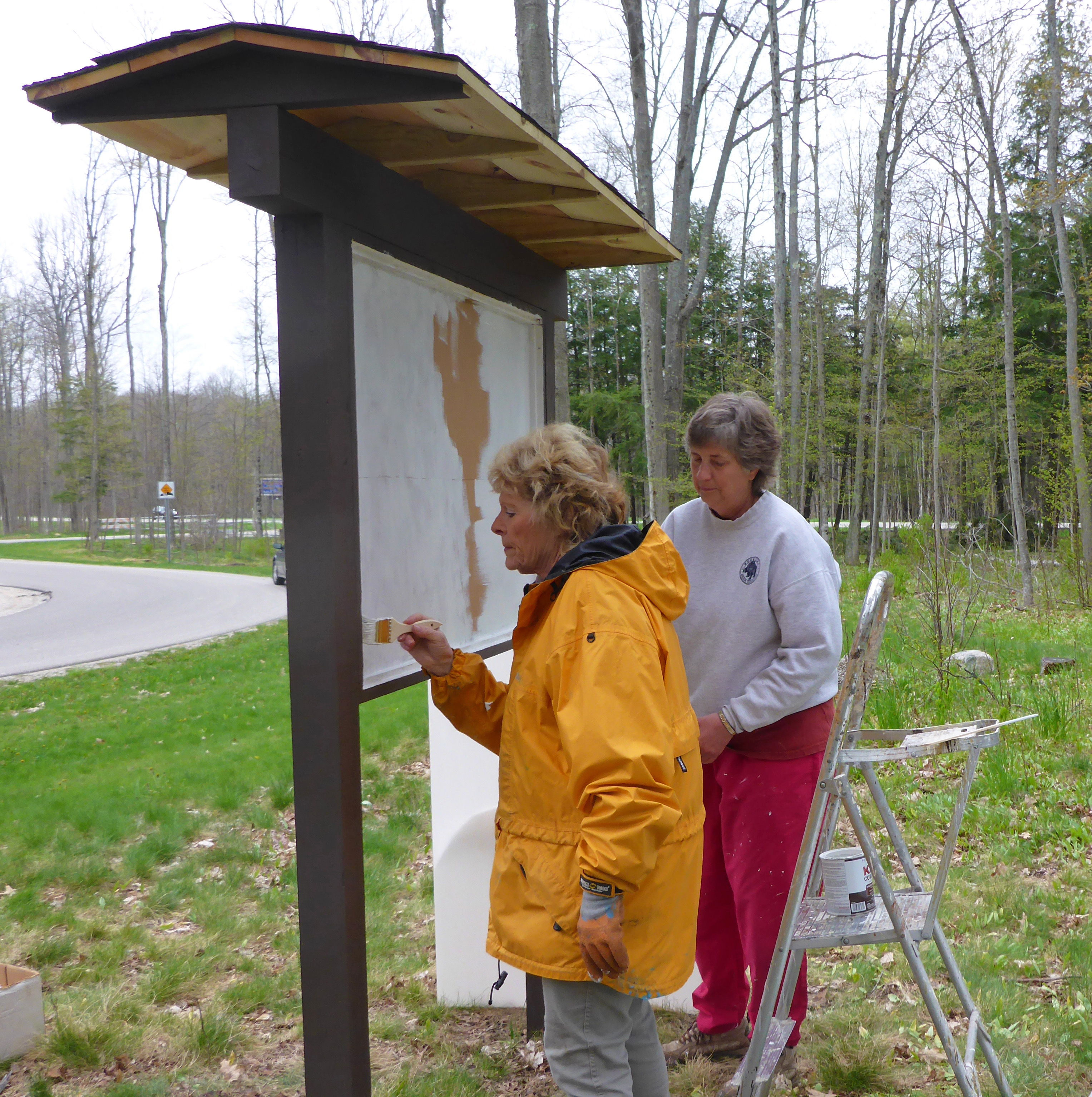 Grand Traverse Hiking Club volunteers, Deena Barshney (left) and Marilyn Hoodstraten, help paint a new trailhead kiosk for the North Country Trail. Photo: Howard Meyerson