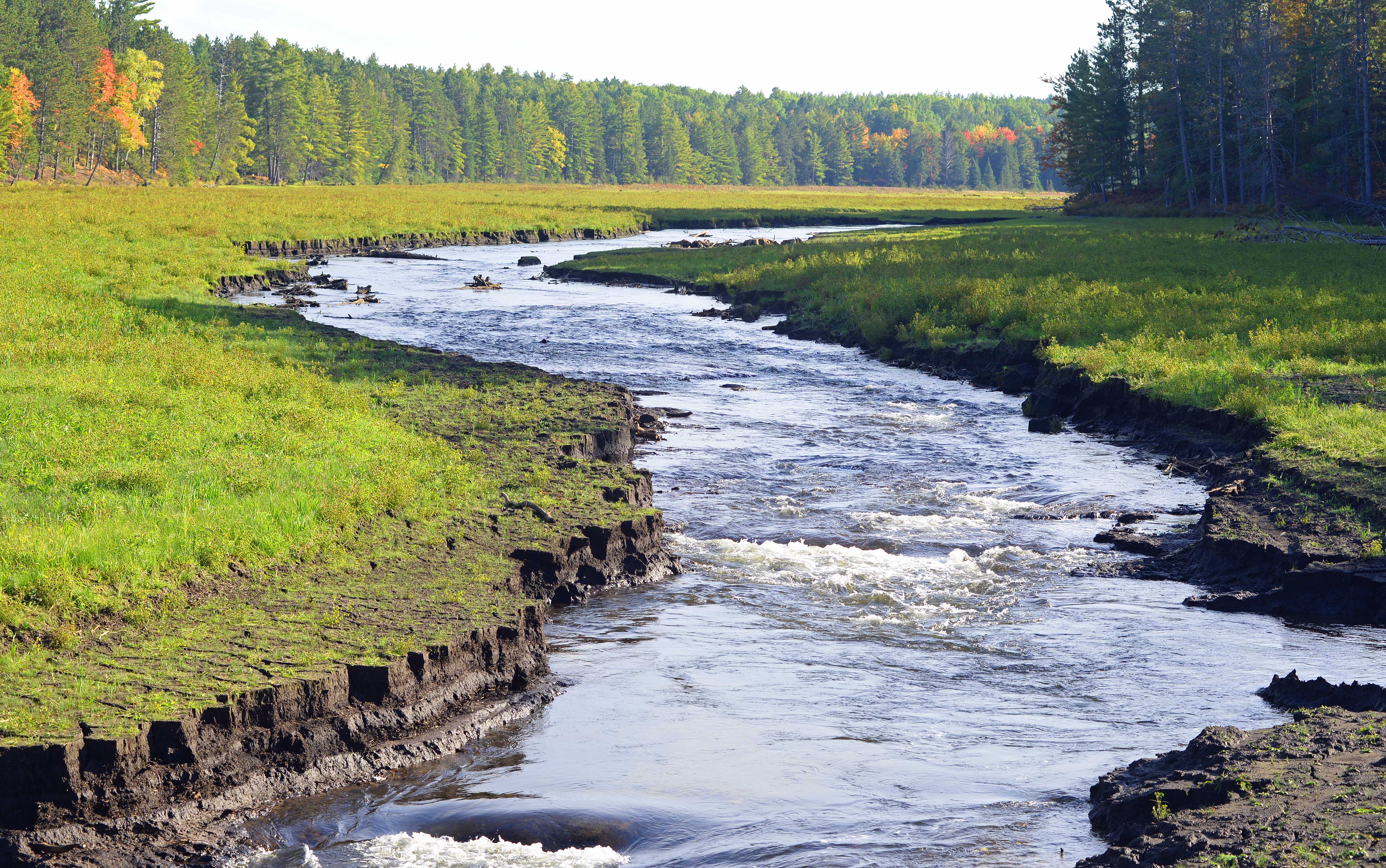 The Pigeon River cuts a channel through the muck were there was once a eight-foot deep impoundment. behind the dam. Photo: Howard Meyerson