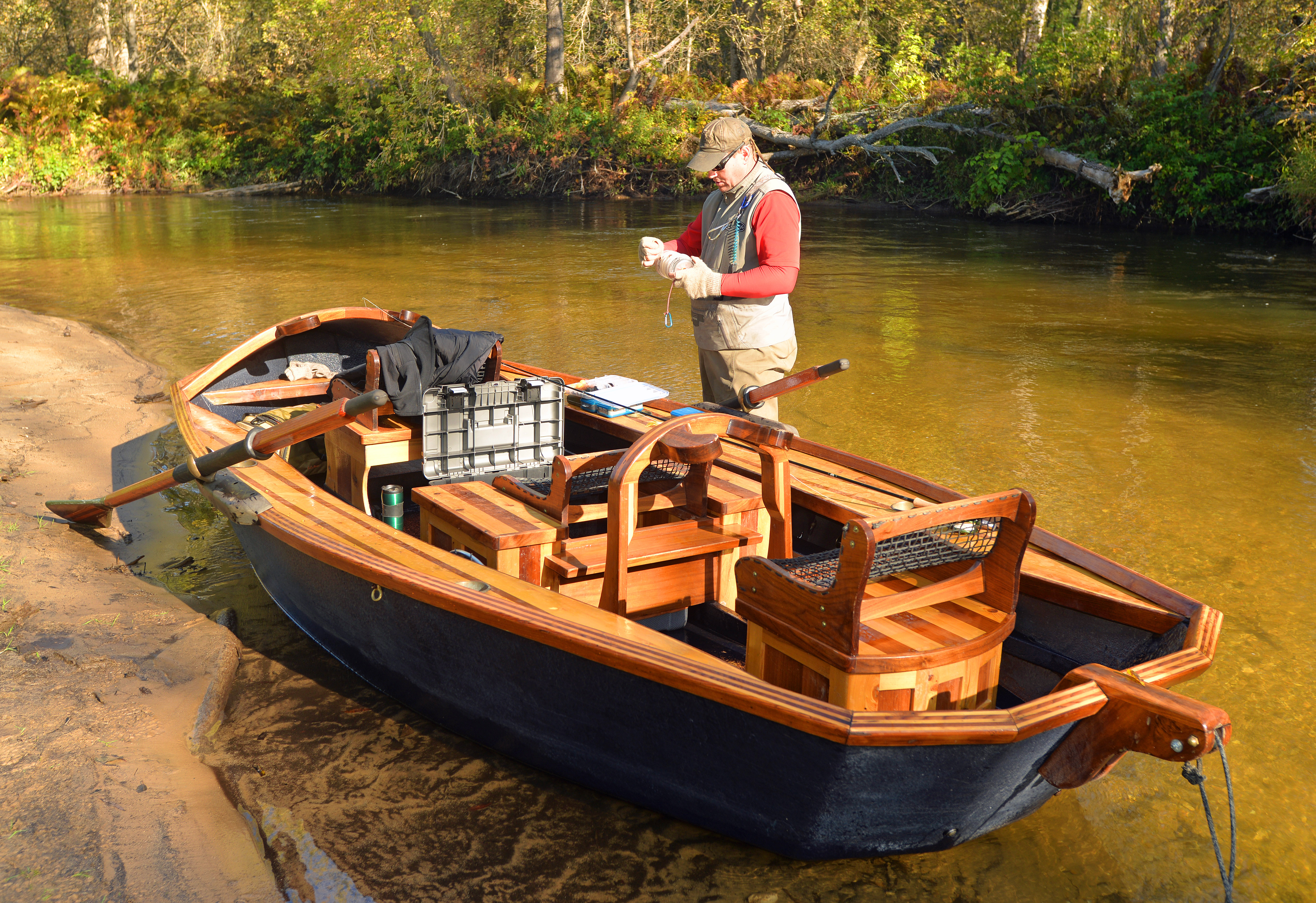 Phil Croff’s cedar and walnut drift boats provide a stable platform to fish from on the swift northern Michigan rivers where he guides anglers. Photo: Howard Meyerson