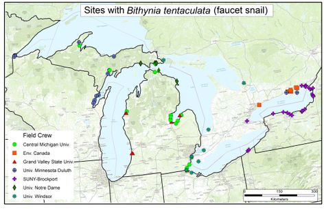 What the wetland scientists expected to find were more “localized” populations of the snails, based on earlier distribution maps developed by the U.S. Geological Survey, but instead they found the snail widely distributed in Michigan and other Great Lakes waters.