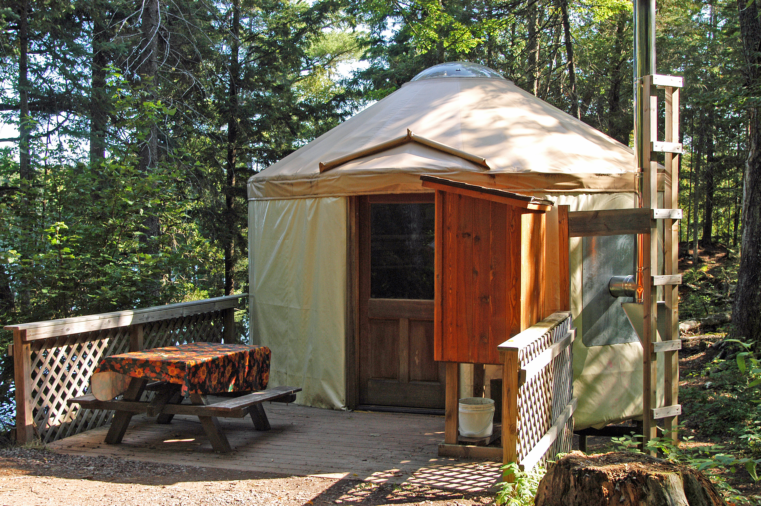 The 16-foot-diameter yurt at Craig Lake State Park sleeps four people and is equipped with bunk beds, mattresses, a wood stove, axe, bow saw, and cooking and eating utensils. Running water and electricity are not provided, but an outhouse is located nearby. Photo Howard Meyerson.