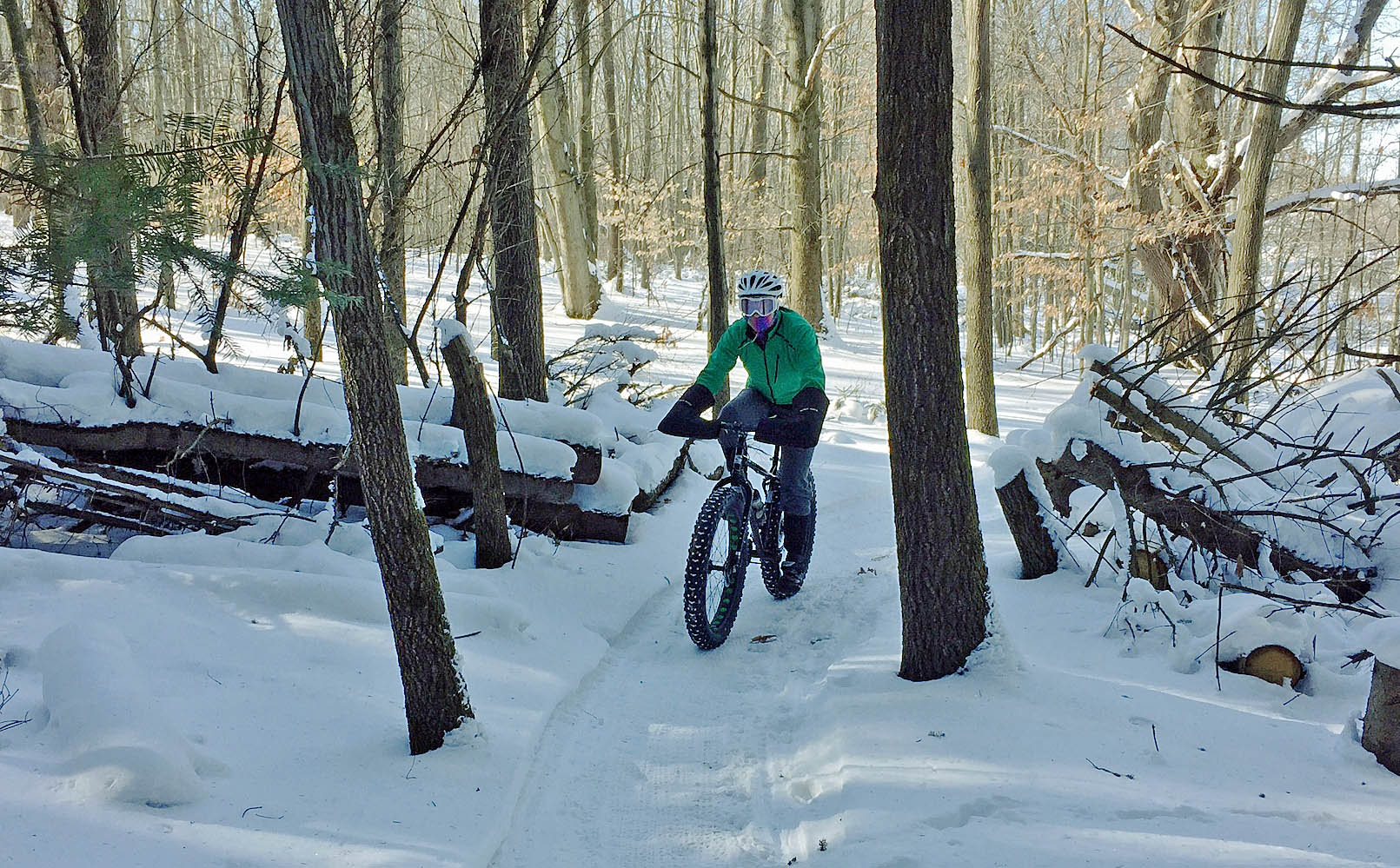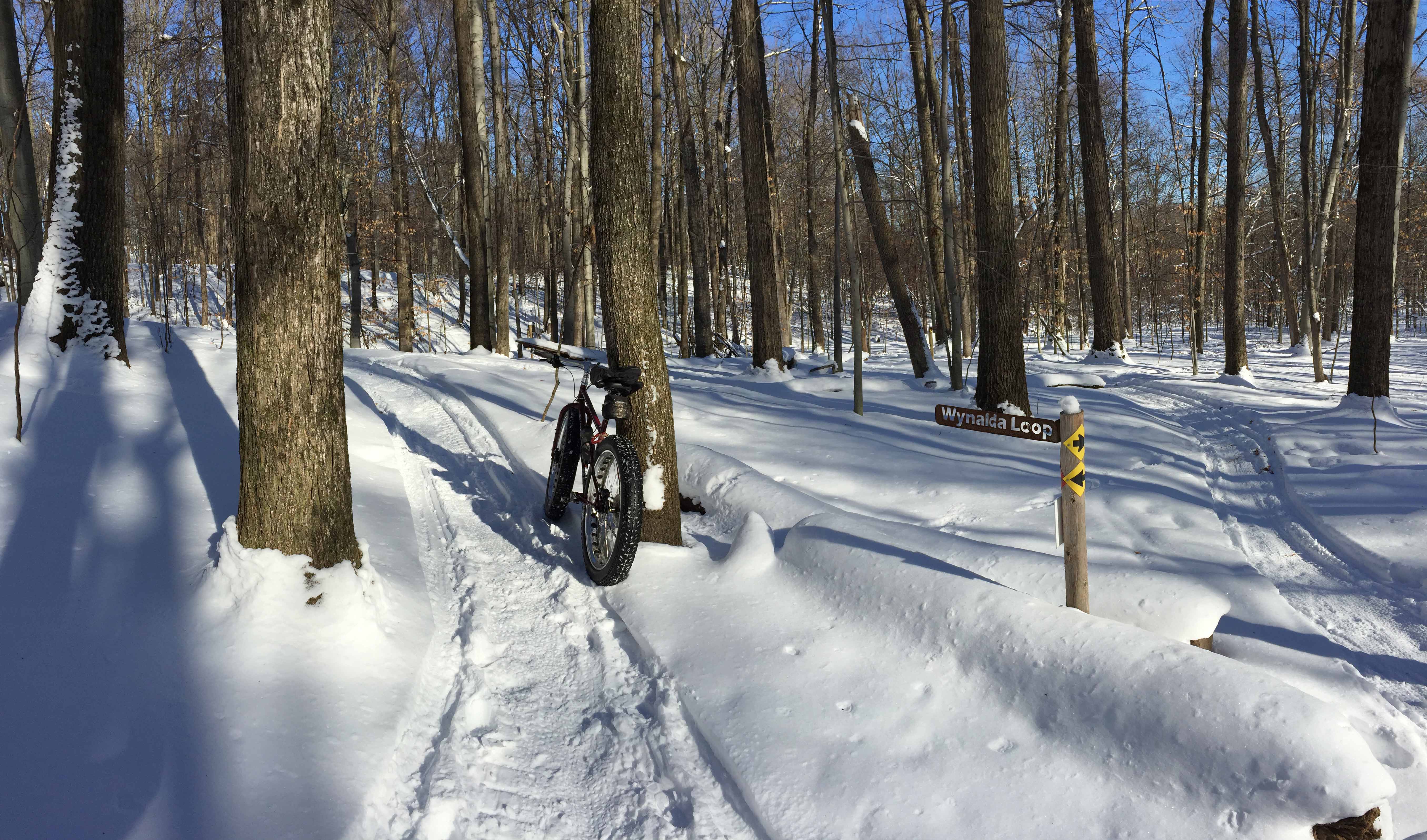 Winter beauty is found on groomed snow-bike trails like this loop at Merrell Trail in Rockford, MI. Photo: Kevin Allen.