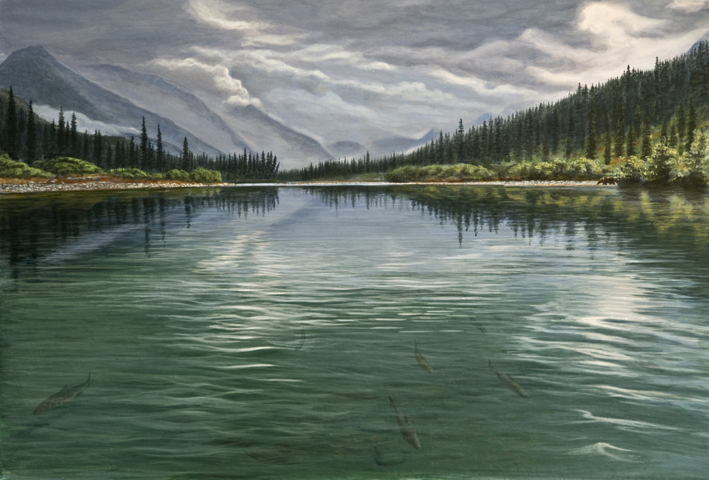 “Crossing Paths” Dog Salmon and Grizzly, Upper Reed River, Alaska. 15″ x 24″ acrylic studio painting of the fifth Grizzly and the first peaceable one August 17, 2013. Photo: Rob Mullen.