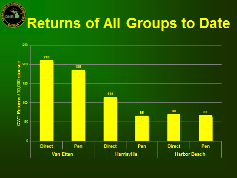 All steelhead were fin-clipped so they could be identified later. A total of 205,653 were stocked during the study. Creel surveys determined that penned and direct-planted steelheads were caught by anglers in the open water fishery. Harbor Beach fish returned best to the open water fishery while Van Etten returned best to the shore fishery. Harrisville returns were low, VanAmberg said.