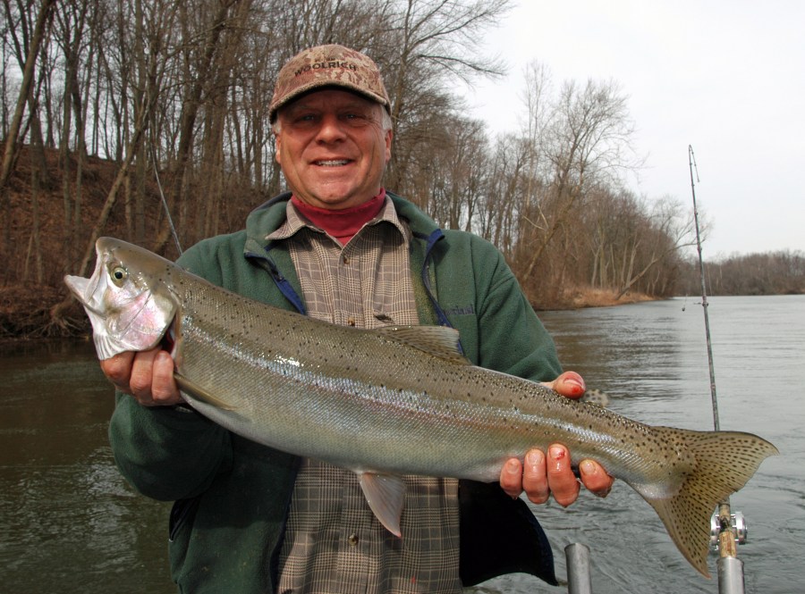 Captain Russ Clark hoists up a nice winter steelhead caught on the St. Joe River in February.